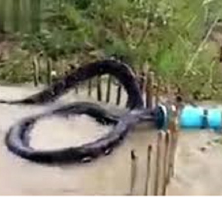 Uma cobra enorme ficou presa em uma armadilha, em vídeo viralizado via Twitter. As imagens são impressionantes. O animal desliza por um espelho d'água até o cercado onde ficam as galinhas. A passagem, colocada de forma estratégica com uma armadilha, fez o réptil "cair como um patinho".