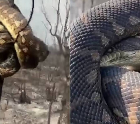 Um vídeo que circula na web mostra uma cobra gigante agarrada ao galho de uma árvore para se salvar da terra queimada. A gravação, capturada na ilha de Moreton, mostra o réptil enrolado em um caule fino e queimado para se manter afastado do calor do fogo.
