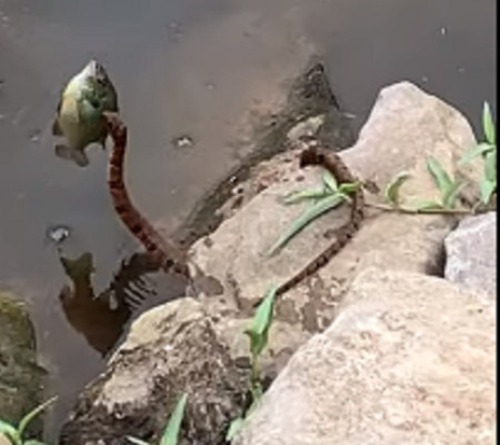 Nos EUA, uma criança de seis anos conseguiu pescar uma brema, mas, ao tirar o peixe d’água, viu que este estava sendo abocanhado por uma cobra.