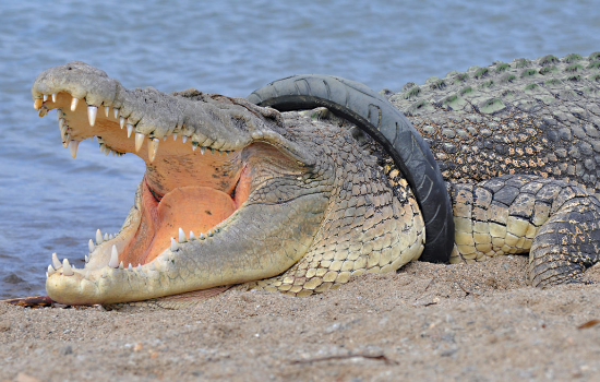 Crocodilo com pneu em volta do pescoço (Foto: reprodução)