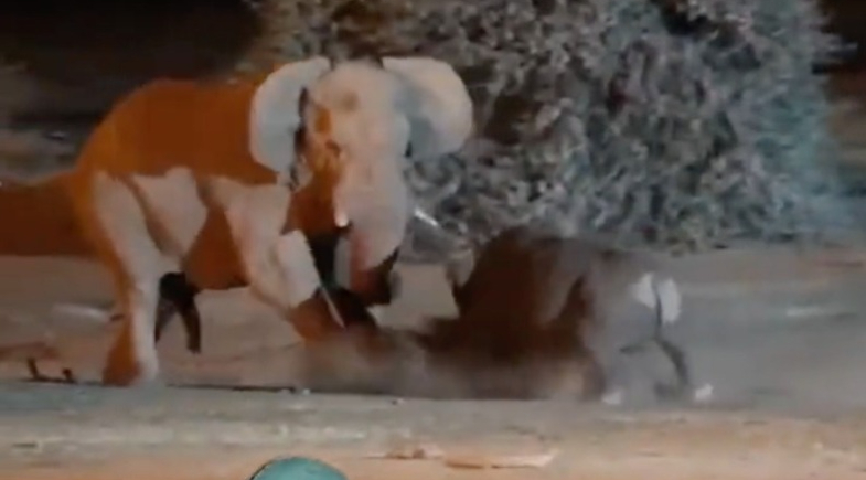 A briga começa por parte do rinoceronte-branco, que acabou encontrando um elefante macho ainda jovem. Mesmo novo, o elefante consegue sobressair o inimigo e colocá-lo para correr.