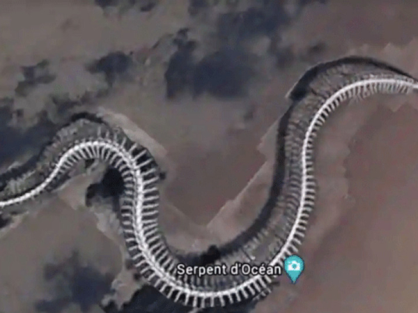 Usuários do Google Maps, plataforma de visualização de imagens de mapas via satélite "detectaram" um esqueleto gigante de cobra na costa da França.