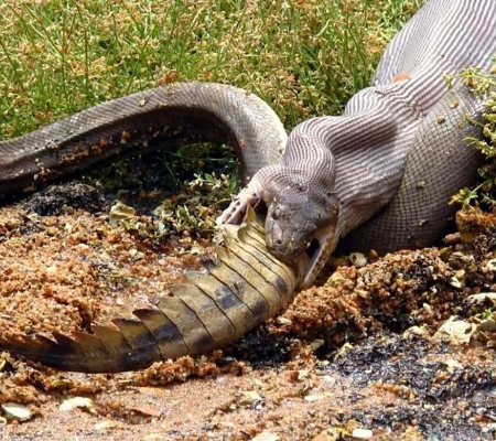 Uma série de fotos impressionantes mostra uma cobra píton devorando um crocodilo. A espécie da serpente (Liasis olivaceus) pode chegar a 4 metros de comprimento e é a segunda maior da Austrália.