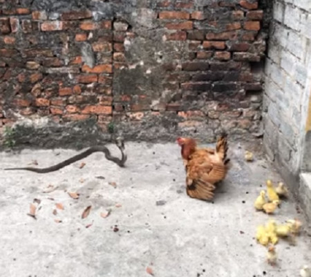 Com a bravura da galinha, por sorte, suas crias foram salvas da cobra. Assista: