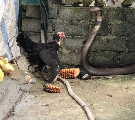 Galinha trava uma batalha com uma cobra para proteger seus pintinhos. A serpente faminta se aproximou do galinheiro para tentar capturar e se alimentar dos pequenos pintinhos.