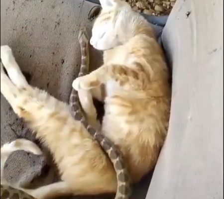 Um vídeo divulgado pelo perfil no Instagram @ vem causando aflição em quem assiste. Nas imagens, uma cobra parece “dançar” por cima do gatinho dorminhoco como se estivesse preparando um ataque.