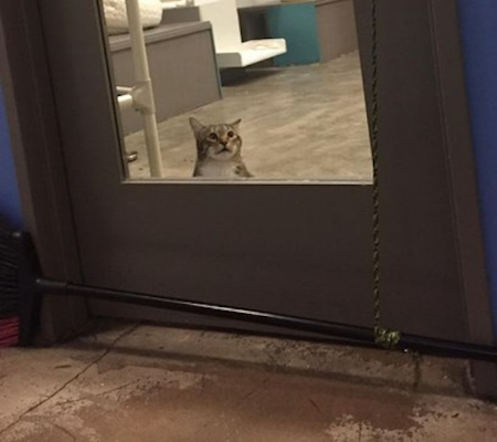 A solução para evitar que o felino abrisse a porta para os outros animais do abrigo foi uma tranca improvisada: uma linha que prende a maçaneta em uma vassoura, fazendo peso para que o animal não consiga abrir pulando.