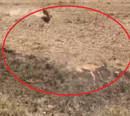 A gazela, nas imagens consegue escapar, num primeiro momento da leoa, entretanto, num segundo momento, por um descuido em uma queda sua, foi capturada.