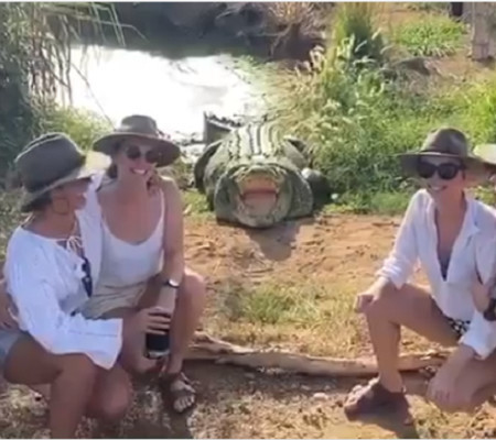 Um grupo de turistas australianas não esperavam que levariam um susto ao tirar foto com um crocodilo gigante.