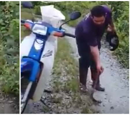 Um homem cortou a cabeça de uma cobra com uma foice depois de avistá-la na beira da estrada no estado malaio de Kelantan, na Malásia.