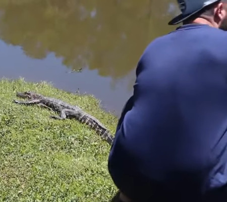Querendo tirar uma onda, o homem chegou perto do animal para tirar uma selfie no seu celular. A princípio, o jacaré parecia não estar dando bola com a aproximação de mansinho do homem.
