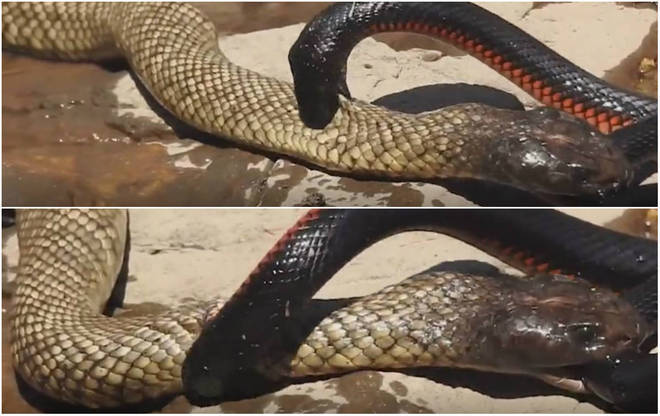 Imagens incríveis registradas pela cinegrafista amadora Jenny Hillman, em Queensland, na Austrália, mostram uma "batalha até a morte" entre duas serpentes extremamente venenosas: uma Pseudechis porphyriacus, ou Cobra negra de barriga vermelha, e uma Pseudonaja textilis, popularmente conhecida como Cobra-marrom.