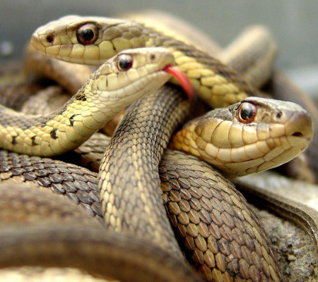 Raymond garantiu que não havia risco, pois o veneno das três espécies - cobra negra de barriga vermelha, cobra-tigre e cobra-marrom do leste - tinha sido removido.