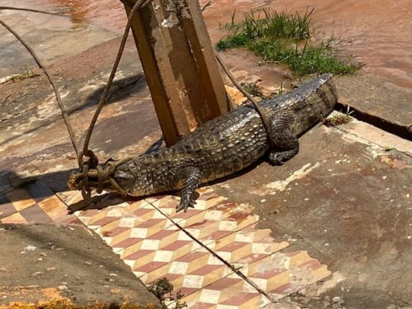 Um jacaré, de cerca de 1 metro e meio, apareceu na calçada de uma residência, na noite deste sábado (06), no bairro São José, em Picos. Com as chuvas causando transtornos, diversas ruas ficam alagadas, ocasionando o aparecimento do animal na residência.