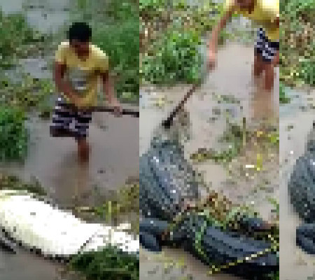De acordo com as Informações, o jacaré foi capturado por comunitários da vila e depois foi morto pelos ribeirinhos. As imagens são chocantes, que mostram o animal sendo a arrastado e morto com um machado. Nas imagens é possível ver um homem desferindo golpes na cabeça do animal, que aparece já sem reação. Alertamos que o vídeo a seguir contém imagens fortes.