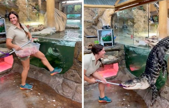 Jacaré gigante salta de tanque e surpreende tratadora em zoológico; vídeo