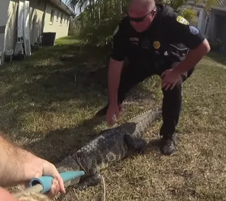 No momento que o policial tenta remover o réptil ele começa a disparar seu giro da morte em uma tentativa de atacar o policial, inclusive mostrando suas grandes mandíbulas. Aos poucos, aparentemente o jacaré perde a força e, depois de uma série de tentativas, acaba sendo dominado pelos policiais.