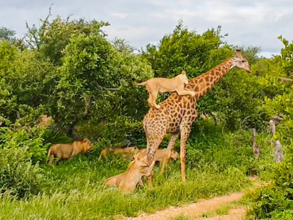 Um grupo de leões foi flagrado tentando derrubar uma girafa para devorá-la em um safári na África do Sul. Nas imagens é possível ver algo inusitado: um dos leões chegando a “pegar uma carona” nas costas do enorme mamífero. Segundo Francois Pienaar, fiscal do local, uma presa desse tamanho dificilmente é ignorada por esses predadores.
