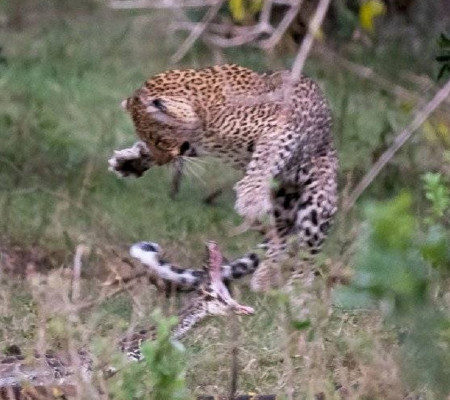 Vídeo gravado na savana africana mostra um leopardo dando um salto para pegar sua presa, uma antílope. Assim que o leopardo pula, os dois animais dão uma cambalhota no ar, vindo a cair no chão em uma perfeita imobilização do antílope. Depois de enfiar as garras na impala, as chances de sobrevivência da presa eram mínimas.