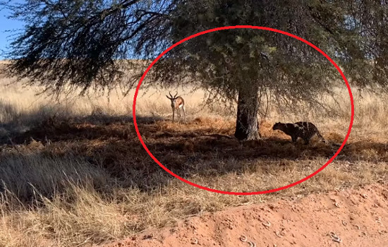 O registro foi feito por Johan Cronje, que estava visitando o safari com sua família. Em um determinado momento, o visitante avistou o leopardo observando atentamente sua presa debaixo de uma árvore.