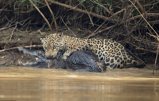 Nas imagens, o leopardo após ter vencido o embate contra um jacaré, escala algumas pedras com o animal na boca para levá-lo para a mata.