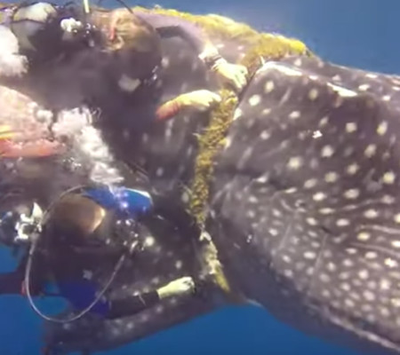 Durante uma visita guiada pelo fundo do mar, Simone Musumeci e Antonio Di Franca avistaram um tubarão-baleia preso por um pedaço de corda velha em torno do seu corpo, entre a cabeça e as barbatanas. Rapidamente, decidiram agir, antes de perder o animal de vista.