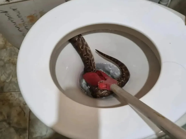 Samuel acionou a Policia Militar de Meio Ambiente, que fez a captura do réptil. Segundo o cabo Braytner Mendes, a cobra, que estava na parte oca da bacia do assento, é uma jiboia arco-íris, media um metro e não é venenosa.