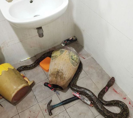 Uma mulher lutou com uma cobra no banheiro depois que o animal a atacou enquanto ela se sentava no vaso sanitário. Imagens horríveis mostram as paredes e o chão do banheiro cobertos de sangue depois que o réptil afundou suas presas em sua coxa.
