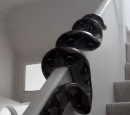 Uma cena inusitada foi registrada por uma moradora da cidade de Plymouth, na Inglaterra, na última segunda-feira (16). Depois de tomar um banho refrescante, uma cobra píton de estimação foi flagrada praticando seu exercício matinal e 'escalando' o corrimão da escada da casa. As informações são do IG.