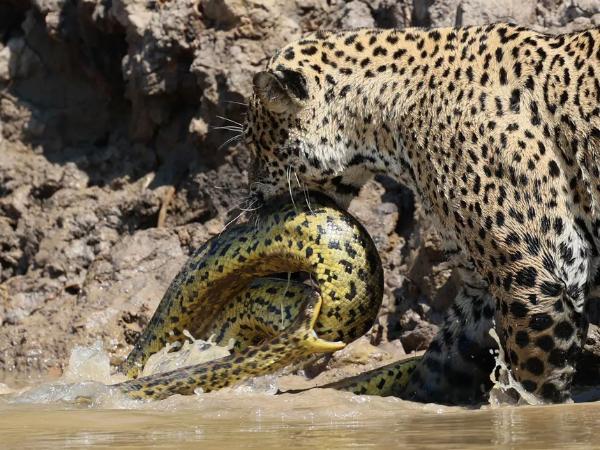 Uma onça-pintada foi flagrada lutando com uma sucuri no Rio Três Irmãos, no Parque Estadual Encontro das Águas, na região do Pantanal, em Mato Grosso. A batalha entre os animais foi flagrada pelo guia turístico Branco Arruda.