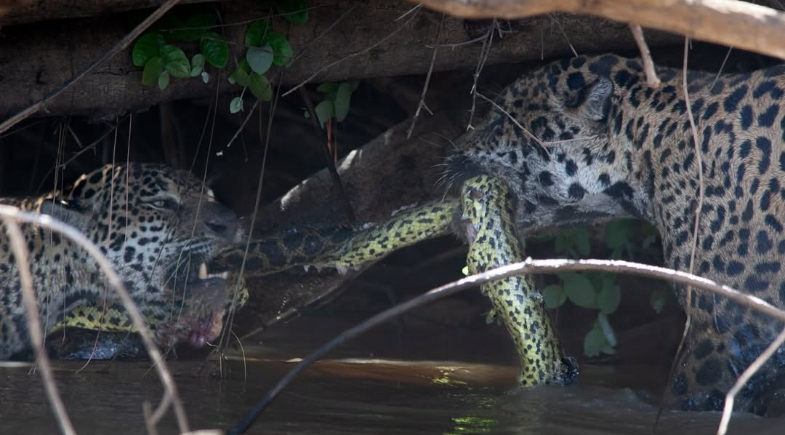 Nas imagens, os felinos aparecem em lados opostos da cobra: a fêmea segura a cabeça do réptil, enquanto o macho puxa pela cauda. A luta, segundo o fotógrafo, durou mais de duas horas e só terminou quando a sucuri acabou partida ao meio.
