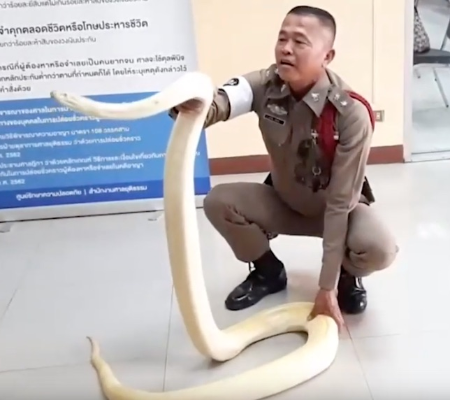 Uma píton birmanesa albina foi levada em um saco fechado a uma esquadra policial depois de ter escapado do recinto de espécie protegida. O réptil invadiu uma residência em Saraburi, cidade no centro da Tailândia, nesta quinta-feira (21).