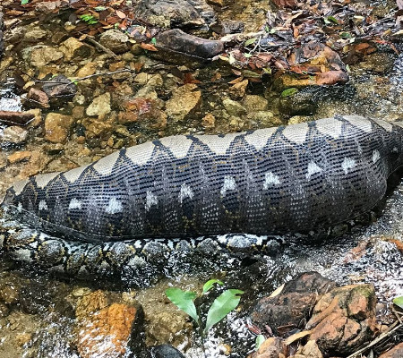 No vídeo ainda é possível escutar os comentários dos integrantes do grupo, que variavam o tom entre susto e surpresa ao encontrar a grande píton relaxando na calma correnteza do riacho, depois de sua farta refeição.