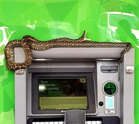Clientes foram surpreendidos ao entrarem em um banco em Queensland, na Austrália, e encontrarem uma píton "tomando conta" de um caixa eletrônico.