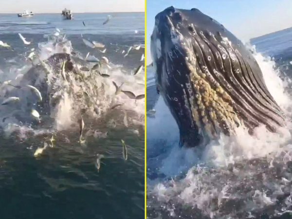 As imagens mostram o instante em que a água do oceano Atlântico começa a “fervilhar” com muitos peixes saltando na superfície. De repente, surge a cabeça da enorme jubarte ao lado do pequeno barco em que estavam pai e filho.