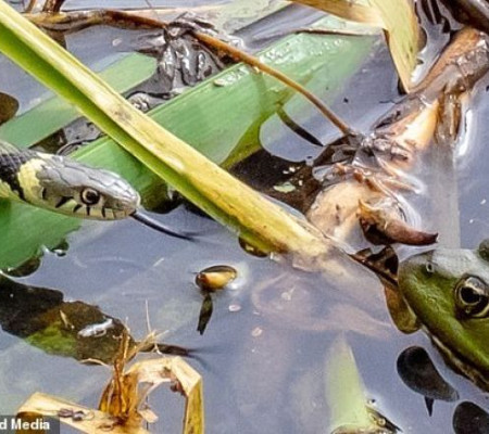 Imagens incríveis mostram o momento em que um sapo destemido tentou comer uma cabeça de cobra. O sapo do pântano ficou cara a cara com uma cobra de 50 centímetros na Reserva Natural Tophill Low, no East Riding of Yorkshire na Inglaterra. Mas as leis da natureza pareciam reverter quando o sapo abriu a boca e apertou a cabeça do animal.