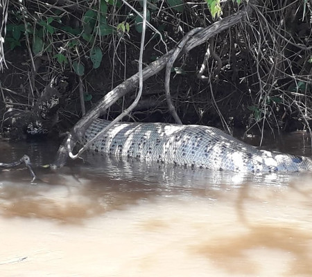 Ainda de acordo com o jornalista, todos ficaram surpresos com o tamanho do animal que segundo ele, estava com a cabeça para fora do rio, parte do corpo boiando na água e parte do rabo enrolado em um galho, para se apoiar.