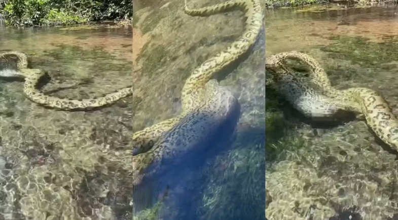 Uma sucuri foi flagrada logo após engolir uma capivara no Rio da Prata, localizado entre os municípios de Bonito e Jardim, na Serra da Bodoquena, em Mato Grosso do Sul. O registro, feito na manhã de segunda-feira (20), chamou atenção pela clareza das imagens e pela tranquilidade do animal nas águas cristalinas, cenário típico da região turística.
