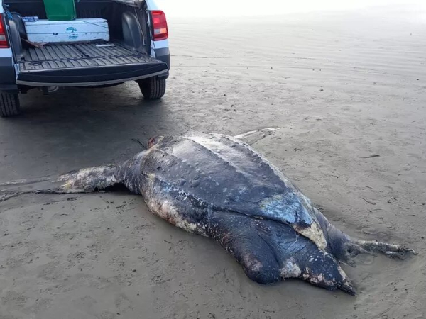 Uma tartaruga-de-couro (Dermochelys coriacea), de 2,11 metros, foi encontrada morta por um banhista em uma praia no bairro Oásis, em Peruíbe, no litoral de São Paulo. O Instituto Biopesca foi acionado e precisou fazer a necropsia ainda na faixa de areia por conta do tamanho do animal. O procedimento, de acordo com o órgão, normalmente é realizada na sede da instituição.