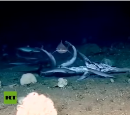 Um vídeo captado pelas câmeras da Administração Nacional Oceânica e atmosférica dos Estados Unidos (NOAA) mostrava um banquete de tubarões no fundo do oceano termina com incrível imagem de um peixe engolindo um dos predadores.