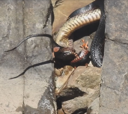 No final do vídeo serpente negra menor parece imóvel, pendurada na boca da serpente maior. O professor Bryan Fry, da Faculdade de Ciências Biológicas da Universidade de Queensland, disse ao Daily Express que não é incomum as serpentes negras malhadas comerem outras cobras.