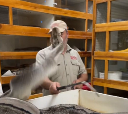 Essa foi por pouco. Uma enorme píton, para defeder seus ovos, deu um bote certeiro na rosto de um cuidador de cobras, Jay Brewer. Ele é dono de uma espécie de zoológicos nos EUA.