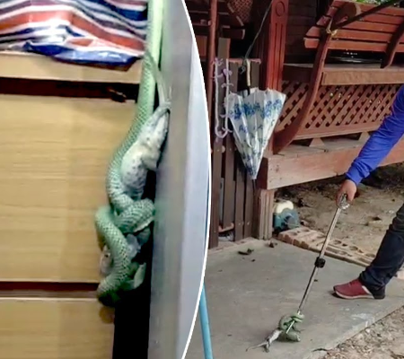 As imagens mostram o momento chocante de uma cobra comendo um geco no meio do quarto de uma casa, situada em Kalasin, no nordeste da Tailândia.