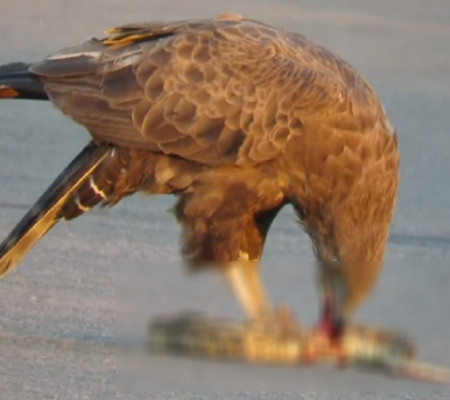 Assim que a serpente deslizou pela estrada, a águia a agarrou e começou a devorar suas vísceras, enquanto a víbora venenosa ainda estava viva. Sertamente o réptil recebeu uma morte dolorosa e lenta.