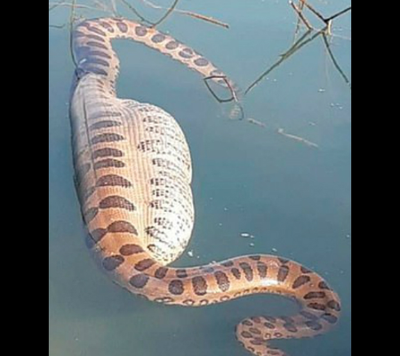 As imagens mostram a enorme anaconda na superfície da água com o estômago inchado depois de comer o roedor - que pode pesar até 91 quilos.
