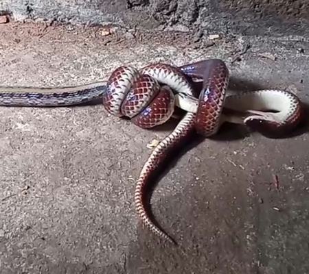 A moradora conta que a briga ocorreu entre uma cobra solar e uma cobra-rato. A cobra-rato aparentemente não teve a menor chance contra a cobra solar, e foi literalmente devorada, tanto que as cenas do vídeo publicado nas redes sociais mostram a cobra solar dominando e cravando suas mandíbulas, para finalmente, devorar sua adversária.