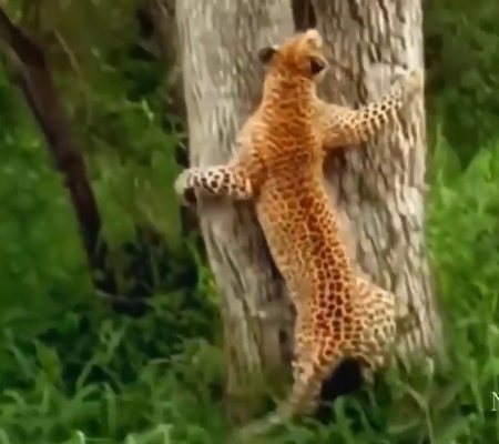 A mãe percebeu que seu filhote estava em perigo e correu para acudi-lo, escalando uma árvore imensa e derrubando o leopardo macho de uma altura incrível.