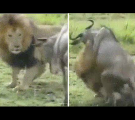 Um leão adulto mostrou seus reflexos surpreendentes para evitar um gnu que se aproximava antes de afundar os dentes no pescoço. A incrível filmagem começa com o bezerro gnus bravamente atacando o predador.