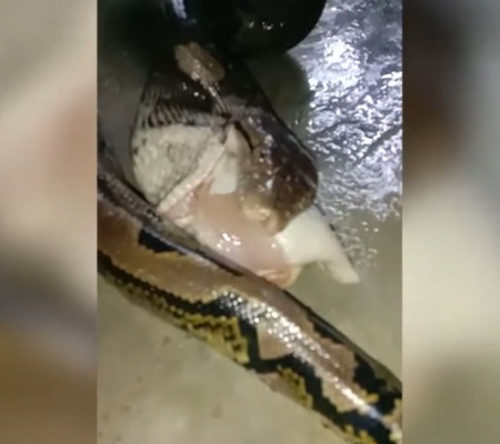 Um vídeo publicado nas redes sociais por um funcionário de uma equipe de resgate mostra cenas de "embrulhar" o estômago, quando uma píton decide mostrar suas grandes mandíbulas para devorar um frango cru. As informações são do Sputnik.