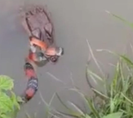 Um vídeo que está circulando nas redes sociais mostra o momento em que um jacaré aparece em um poço com uma cobra coral, considerada muito venenosa, na boca.